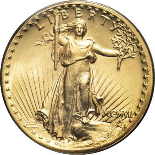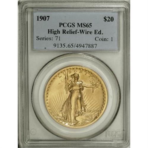 <B>1907 $20 High Relief, Wire Rim MS65 PCGS.</B></I> The relationship between Charles Barber, imperious Chief Engraver of the United States Mint, and Augustus Saint-Gaudens, the artistic visionary who stood at the forefront of American Renaissance-era sculpture, was not always antagonistic. When the Mint began its search for new coinage designers with its planned 1890 competition, the shortlist of 10 artists included Saint-Gaudens, who was not only consulted by the Mint, but received the recommendation of Barber, according to a letter cited by Roger Burdette in his 2006 work, <I>Renaissance of American Coinage 1905 - 1908</B></I>. Saint-Gaudens declined to compete, but after the coinage redesign challenge was delayed and opened to the public, he agreed to serve on the jury, which convened in 1891.<BR> Burdette suggests that the face-to-face interaction and arguments over aesthetics resulting from the competition soured the connection between them: "Barber and Saint-Gaudens evidently disagreed on many points of art during the jury's discussions, and had little in common. It is likely they were so far apart in their artistic understanding that neither listened to what the other had to say. ... The 1891 competition turned the two against one another for the rest of their lives."<BR> Even the longstanding antagonism between the artists would not stand in the way of Theodore Roosevelt, and the High Relief double eagles were struck over the Chief Engraver's indignant protests. This Gem survivor shows evidence of a wire rim at the right obverse. The shining surfaces are primarily apricot-gold with elements of sun-yellow and orange. Decisively struck as always with two small rim marks at the lower obverse, but no flaws of any significance at the centers. An important and beautiful example.<BR><I>From The Florissant Collection.</B></I><BR><BR><B>Coin Engraver:</B> Augustus Saint-Gaudens<BR><BR><b>Shipping:</b> Coins & Currency (<a target="_blank" href="http://www.heritageauctions.com/common/shipping.php">view shipping information</a>)
