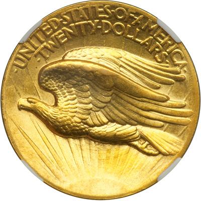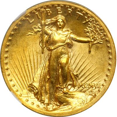 1907 $20 High Relief Wire Rim. NGC graded MS-62. Lovely golden toning graces both sides of this majestic beauty. Augustus Saint-Gaudens' design truly captivated the essence of artistic coinage and hence this piece is one of the most popular U.S. coins ever created. The present coin also has the appeal a collector can be drawn to without hesitation -- not at all the case across the market. The striking is quite sharp, the satiny fields are medium gold, and all else is in order.