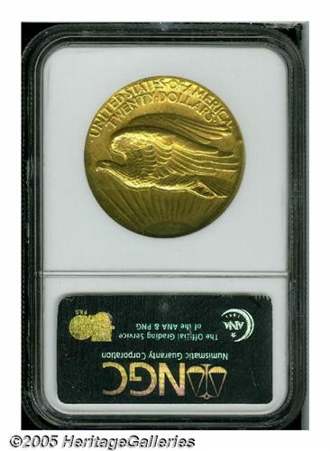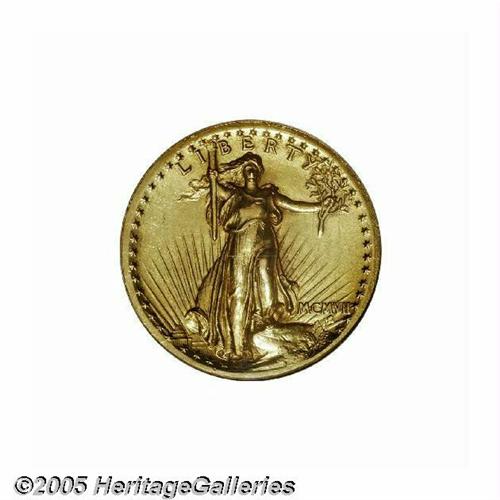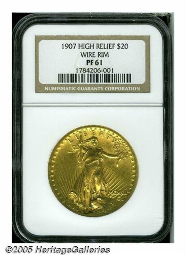 <B>1907<$20> High Relief, Wire Rim PR61 NGC.</B></I> For so many years, the recorded mintage for this High Relief issue was 11,250 coins, however, new research has suggested an actual mintage total of 12,367. An unknown quantity of Proofs were also produced, although distinguishing between the proof examples and the business strikes is difficult. It is believed that the Proof examples were struck by the medal press, with six or seven impressions from the dies for each such coin. This would mean that these proofs are even more sharply struck than the business strikes. Perhaps the only way to distinguish between the proof and business strike High Relief Double Eagles is side-by-side comparison. This example is satiny and lustrous with rich yellow-gold color. The surfaces are lightly marked as suggested by the grade. Overall, this is an extremely important rarity and an excellent opportunity for the advanced collector.