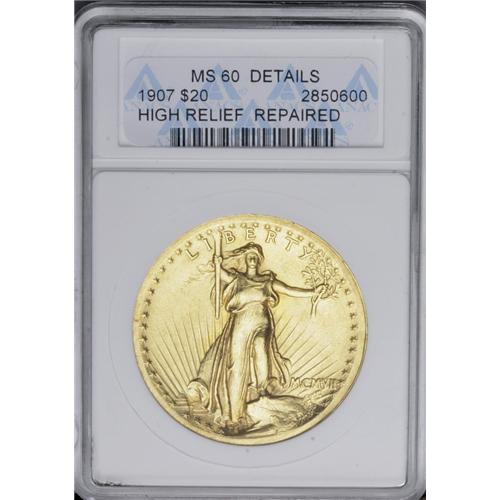 1907 $20 High Relief, Wire Rim--Repaired--ANACS. MS60 1907[$20] High Relief, Wire Rim--Repaired--ANA