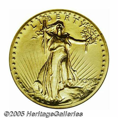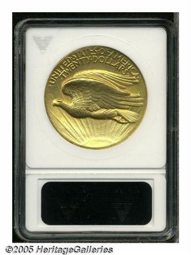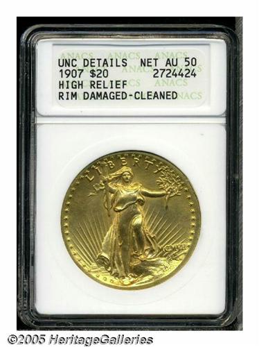 <B>1907<$20> High Relief, Wire Rim--Rim Damaged, Cleaned--ANACS. Unc Details, Net AU50.</B></I> Although moderately hairlined, this lustrous example would be a standout in any gold type collection. A moderate rim ding at 10:30 on the reverse is not readily noticed. Perhaps more desirable than a completely unimpaired but circulated example that would not show full definition of this magnificent, medal-like design.<BR><I>From the Dr. Kurt Peters Collection.</B></I> From the Dr. Kurt Peters Collection.