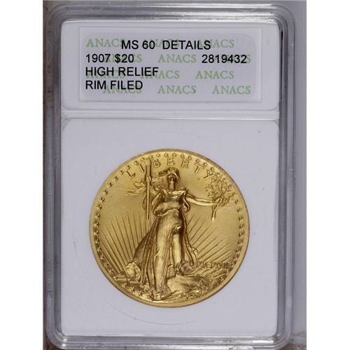 <B>1907 $20 High Relief, Wire Rim--Rim Filed--ANACS. MS60 Details.</B></I> Of the 11,250 High Reliefs minted, it is estimated that up to three-fourths of them were the Wire Rim variety, with the remainder being Flat Rims. The Wire Rim resulted from excessive metal flow between the die face and collar during the striking process. The milling procedure and planchet size for the double eagle blanks were slightly modified to correct this small flaw. This raised metal may or may not encircle the whole coin. On the present specimen, the wire is visible around the entire reverse, but only on a portion of the obverse. Both sides exhibit pretty apricot-gold color, and reveal a few minor abrasions. Portions of the obverse rims display minor filing.