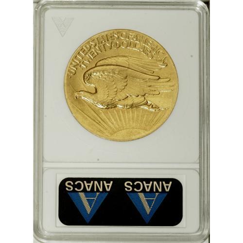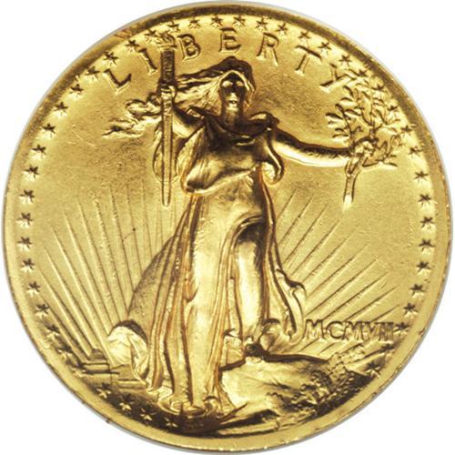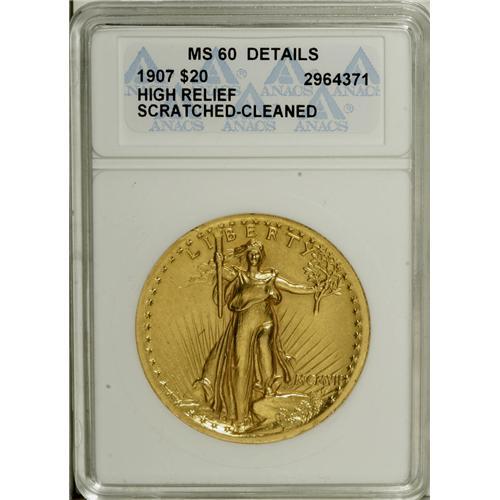 <B>1907 $20 High Relief, Wire Rim--Scratched, Cleaned--ANACS. MS60 Details.</B></I> The reverse exhibits only a few traces of a knife edge, though the obverse displays a significant fin from approximately 1 o'clock to 10 o'clock. Though the amber-gold surfaces are hazy with muted luster and a wispy scratch extends from Liberty's flowing hair to the rim, this coin's remarkable depth and artistry remain untouched. An interesting and affordable example of this renowned design.<BR><BR><b>Shipping:</b> Coins & Currency (<a target="_blank" href="http://www.heritageauctions.com/common/shipping.php">view shipping information</a>)