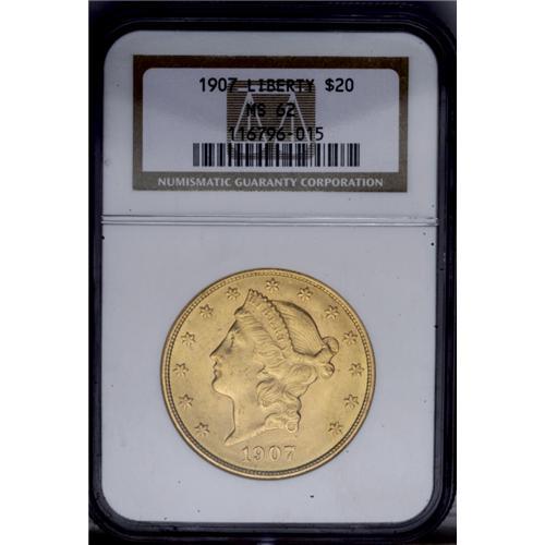 <B>1907<$20> MS62 NGC.</B></I> Bright full luster with rich coloration on both sides, and a minimal number of scattered small marks for the grade. The last year of the Liberty double eagle series.<BR><I>From The Steve Glenn Collection.</B></I> <BR><BR><B>Important notice:</B> Heritage usually auctions material at the rate of 200-250 lots per hour. On some occasions eBay Live bid software or the Internet may not be able to keep up with the pace of the auction. We recommend placing a realistic absentee bid now as insurance to avoid disappointment. Occasionally the auctioneer may eliminate or reject an eBay Live bid, and the auctioneer may also reopen a lot after the close of the eBay live bidding (usually because we missed an audience bid), and may reject your bid even if it shows you as the winning bidder. By bidding via eBay Live, you agree that Heritage may award the lot to another bidder at its sole discretion under the circumstances described above or any other reasonable circumstances. Since eBay bids are not shown to us until we open the lot on the floor, we treat those bids just like floor bids. In most cases the floor responds before the eBay bid is presented to us, due to Internet lag time, so for consistency we have made it a policy that floor bids are always considered first over tie eBay live bids. Also please note that all Heritage lots purchased through eBay Live carry a 20% Buyer's Premium. Please make sure you read the Terms and Conditions before you bid. This lot is being auctioned in conjunction with a live floor auction by Heritage Galleries & Auctioneers. All final auction and invoice information will be supplied by Heritage Galleries & Auctioneers, and all other information should be considered preliminary. Lot:4494 <BR><BR><B>Winning Notification and Billing:</B> After the FINAL session in this auction is complete, Heritage will send e-mail and snail mail invoices. This process normally takes several days. All final auction and invoice information will be supplied by Heritage Galleries & Auctioneers, and all other information should be considered preliminary. <BR><BR>This auction will be conducted on a live auction floor and over the Internet through eBay Live. If you choose to place an absentee bid, please take a moment to <font color='#0000ff'><u><a href='http://pages.ebay.com/liveauctions/help/before/laabsentee.html'>learn how eBay Live absentee bidding works</a></u></font><font color='#000000'>
