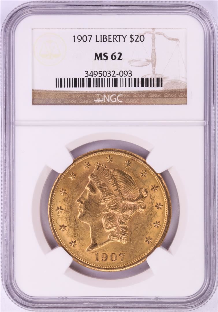 One 1907 $20 Liberty Head Double Eagle Gold Coin NGC MS62. NGC Certified.