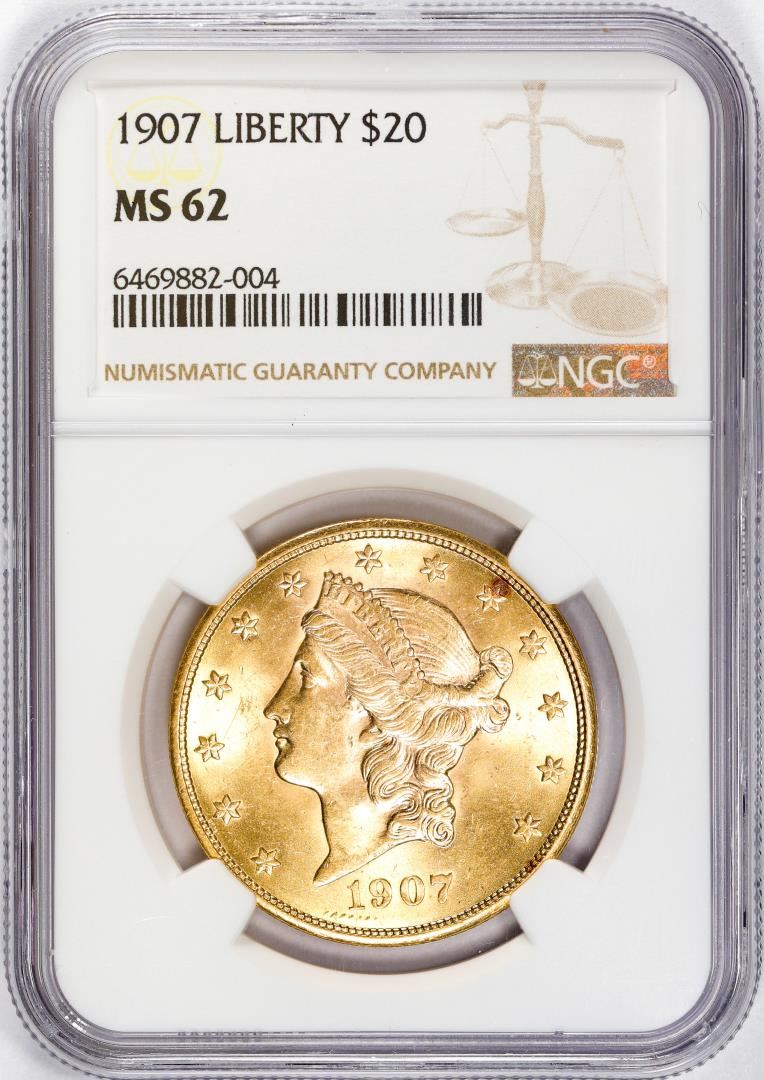 One 1907 $20 Liberty Head Double Eagle Gold Coin NGC MS62. NGC Certified.