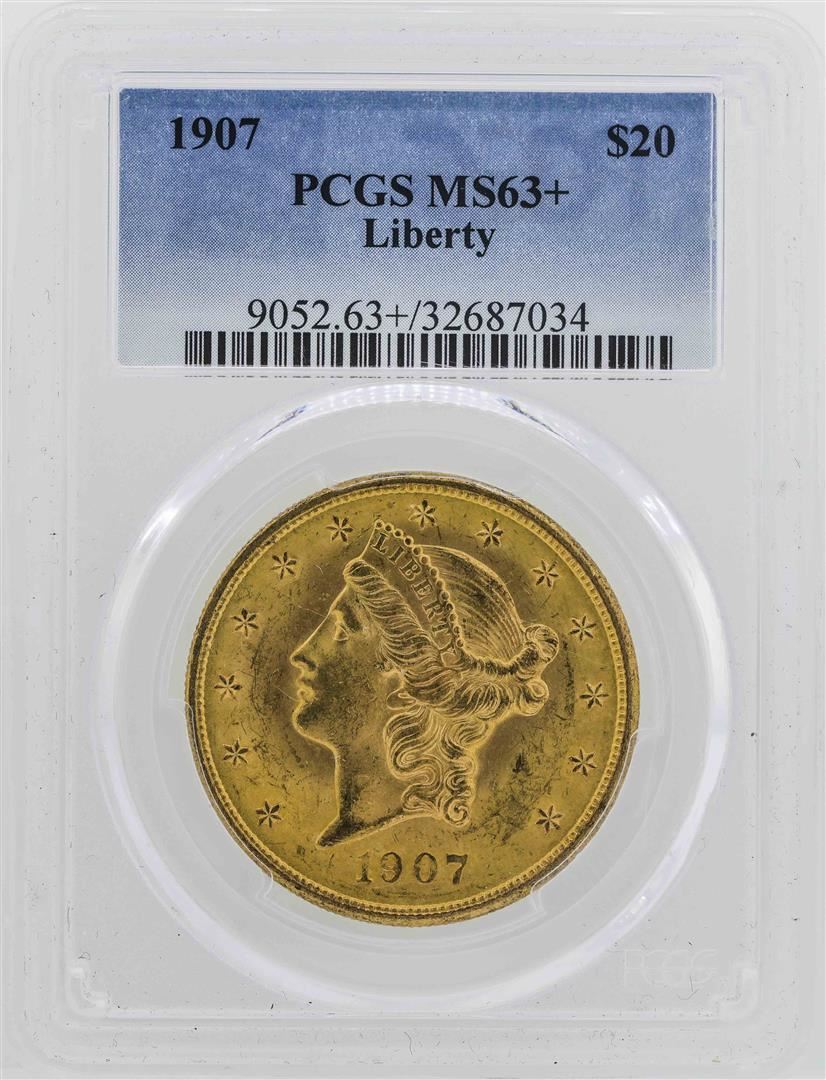 One 1907 $20 Liberty Head Double Eagle Gold PCGS MS63+. PCGS Graded.