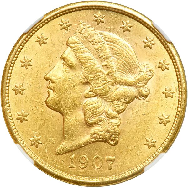 1907 $20 Liberty. NGC graded MS-61. Strong interest in gold double eagles has arisen with the steady advance in gold prices over the last few years (PCGS # 9052) .
