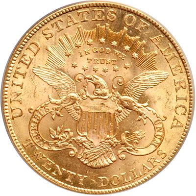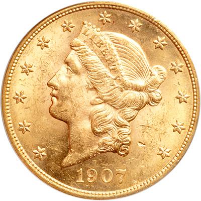 1907 $20 Liberty. PCGS graded MS-62. A hint of delicate toning exists. Has a small flake (as made) in the lower obverse field (PCGS # 9052) .