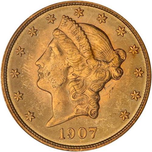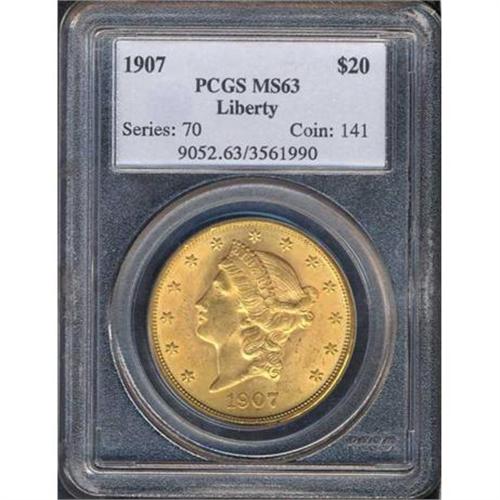 <b>1907 $20 Liberty. PCGS graded MS63.</b> Light reddish gold color with a warm blast of luster on either side <b>(PCGS # 9052)</b> <i>