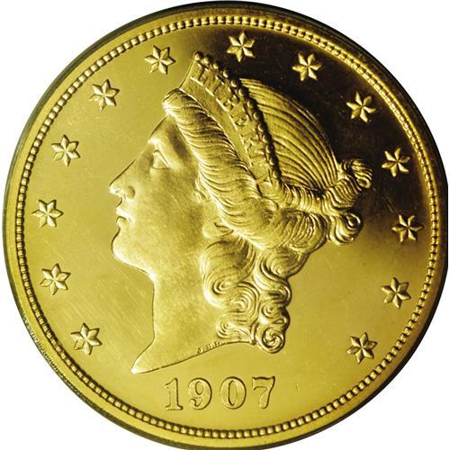 <B>1907<$20> Liberty PR64 Cameo PCGS.</B></I> After a run of 57 years, the Philadelphia Mint retired the Liberty design from the double eagle in 1907 without much fanfare given to the collector market. On the contrary, the excitement created by the new Saint-Gaudens design may have actually lessened the already limited demand for proofs and a mere 78 pieces were struck, the lowest production of any 20th century double eagle up to this point. Population data would suggest that 45 to 55 specimens survive as identifiable proofs.<BR> Offered here is one of the flashier proof 1907 twenties to come our way, a Choice specimen with unusually bold contrast for a proof gold coin from this time frame. The depth of mirrored reflectivity is excellent and there are no signs of contact or mishandling. Inspection with a glass reveals a small pocket of wispy hairlines to the left of the date and lower portion of the portrait. A small lintmark in the reverse field at 9 o'clock should be useful for attribution. The specialist in high quality proof gold should find this dazzling specimen of considerable interest. Population: 7 in 64 Cameo, 2 finer (4/06).