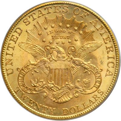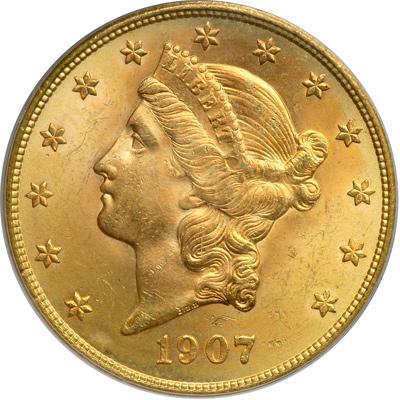 1907 $20 Liberty. PCGS graded MS-64. Glistens with gorgeous mint bloom colors. A remarkable last-year-of-issue coin that emits eye-catching gold color, with no marks or problems on Liberty's cheek for the skeptic to find. A hint of weakness at that is typical for the stars is missing on this sharply struck $20, with the key central areas strongly hit by the dies as well. We can only repeat ourselves: a gorgeous coin! (PCGS # 9052) .