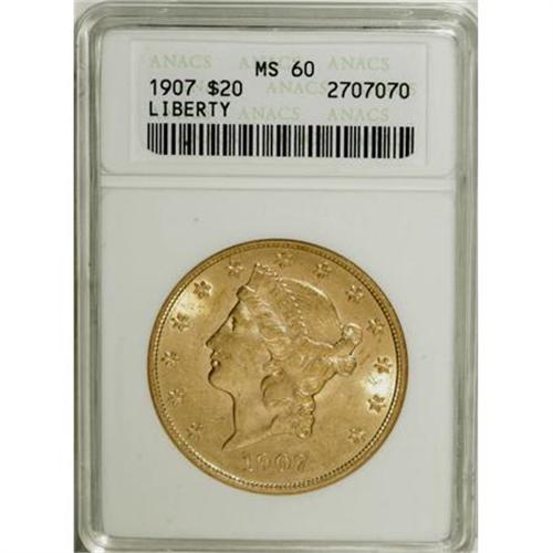 <B>1907 $20 MS60 ANACS.</B></I> NGC Census: (908/20601). PCGS Population (1179/14636). Mintage: 1,451,864. Numismedia Wsl. Price for NGC/PCGS coin in MS60: $825. (#9052)<BR><BR><B>Coin Engraver:</B> James B. Longacre<BR><BR><b>Shipping:</b> Coins & Currency (<a target="_blank" href="http://www.heritageauctions.com/common/shipping.php">view shipping information</a>)
