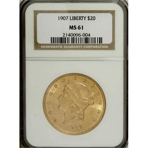 <B>1907 $20 MS61 NGC.</B></I> NGC Census: (5348/14706). PCGS Population (3229/10739). Mintage: 1,451,864. Numismedia Wsl. Price for NGC/PCGS coin in MS61: $730. (#9052)<BR><BR><B>Coin Engraver:</B> James B. Longacre<BR><BR><b>Shipping:</b> Coins & Currency (<a target="_blank" href="http://www.heritageauctions.com/common/shipping.php">view shipping information</a>\)