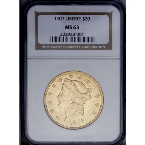 <B>1907<$20> MS63 NGC.</B></I> Flashy apricot-gold surfaces exhibit sharply struck devices. Scattered light contact marks, especially on the obverse, define the grade.
