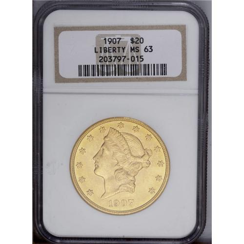 <B>1907<$20> MS63 NGC.</B></I> This attractive apricot-gold final year Liberty twenty displays vivacious luster, and the fields are clean for the designated grade.