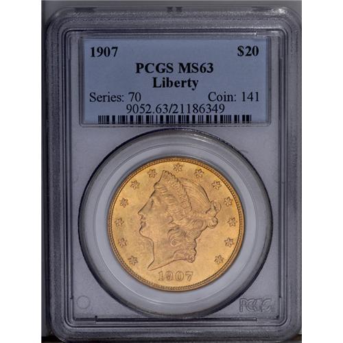 1907 $20 MS63 PCGS. The Liberty Head design, sharply s