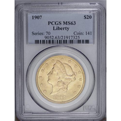 <B>1907 $20 MS63 PCGS.</B></I> Well struck with rich satiny luster and pleasing coloration. A few grade-defining contact marks are evident on each side, but not in excessive numbers for the grade.