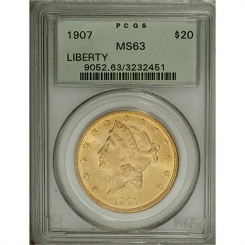 <B>1907 $20 MS63 PCGS.</B></I> PCGS Population (3205/651). NGC Census: (4843/537). Mintage: 1,451,864. Numismedia Wsl. Price for NGC/PCGS coin in MS63: $890. (#9052)<BR><BR><B>Coin Engraver:</B> James B. Longacre<BR><BR><b>Shipping:</b> Coins & Currency (<a target="_blank" href="http://www.heritageauctions.com/common/shipping.php">view shipping information</a>)