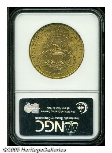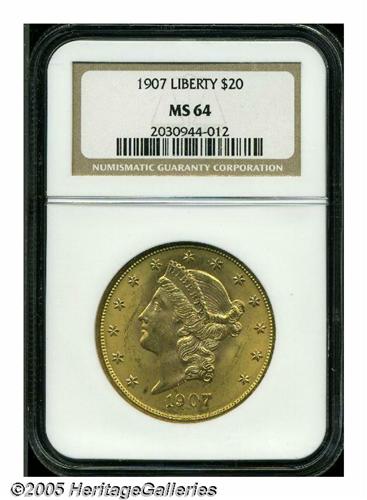 <B>1907<$20> MS64 NGC.</B></I> The 1907 is a common date in all grades up to and including MS63. It becomes slightly scarce in MS64, and Gems are extremely rare. As of April 2005, NGC and PCGS combined have certified only 24 pieces in MS65 and higher. The near Gem offered in this lot displays sharply struck devices, and lustrous honey-gold patina. The surfaces are well preserved, revealing just a few minute marks on Liberty's cheek and in the left (facing) obverse field.