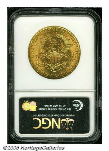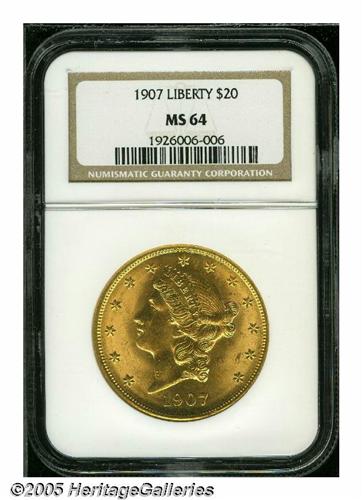 <B>1907<$20> MS64 NGC.</B></I> Well struck with bright, rich coloration and flashy cartwheel luster in the fields. Several small abrasions are on Liberty's neck, and there are some small field marks on each side of the piece, that prevent the Gem assessment.