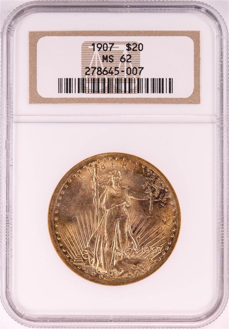 One 1907 $20 St. Gaudens Double Eagle Gold Coin NGC MS62. NGC Certified.
