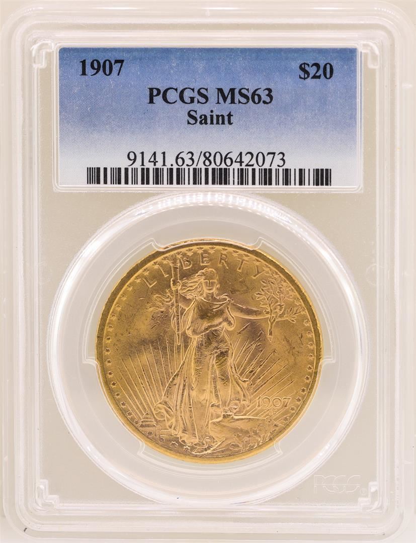 One 1907 $20 St. Gaudens Double Eagle Gold Coin PCGS MS63. PCGS Graded.