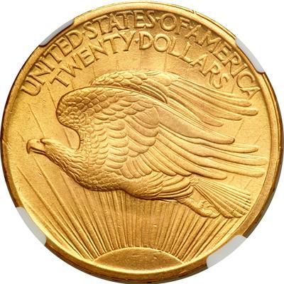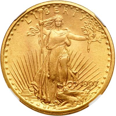 1907 $20 St. Gaudens. Flat relief. NGC graded MS-64. Lovely natural golden toning. Softly struck. Satiny, as befits a coin in which the surfaces are choice with rich natural hues (PCGS # 9141).