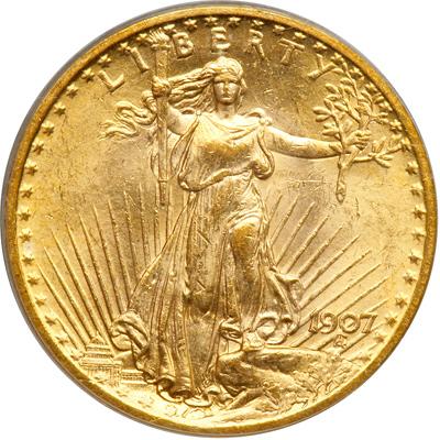 1907 $20 St. Gaudens. Flat relief. PCGS graded MS-63. Intense golden shades are scattered throughout, while at the same time the pleasant satin luster ripples across original surfaces (PCGS # 9141) .