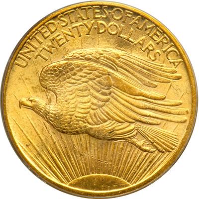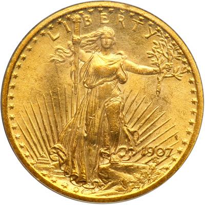 1907 $20 St. Gaudens. Flat relief. PCGS graded MS-63. Reverse stains. Rich golden toning. Swirls of golden luster with richer texture than average for a 1907 Arabic numerals $20 gold piece (PCGS # 9141) .