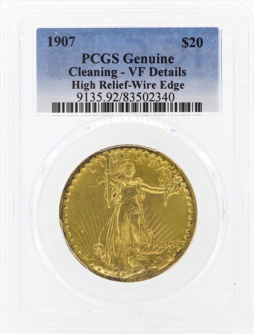 One 1907 $20 St. Gaudens High Relief Double Eagle Gold Coin Wire Edge PCGS Genuine Details. PCGS Graded.