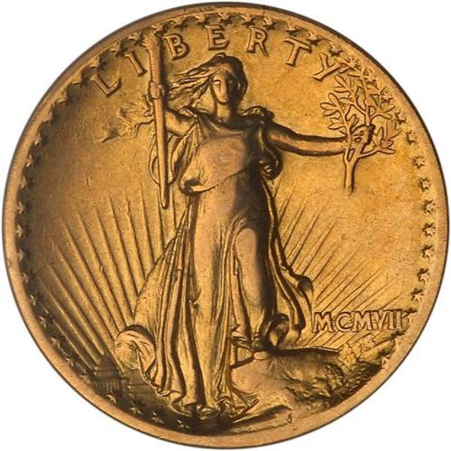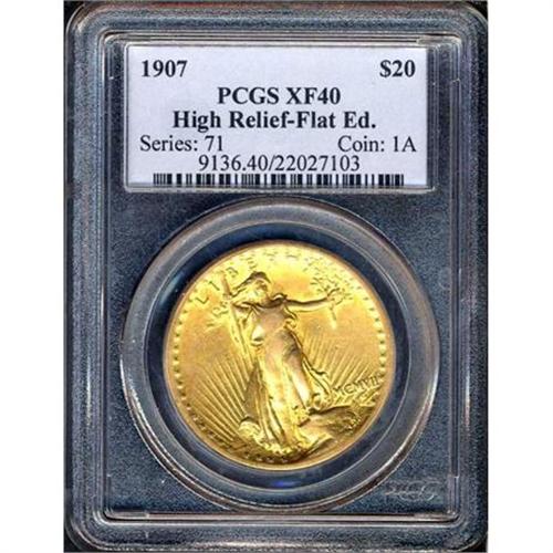 <b>1907 $20 St. Gaudens. High relief, flat rim. PCGS graded EF40.</b> The only evident rub on either side is seen on Liberty's torso and knee along with the eagle's breast and upper curve of the wing; and the still bright-gold features retain the sharpness of detail that accounts for the popularity of this first-year high relief design. Lightly abraded with a few insignificant ticks in the surface.