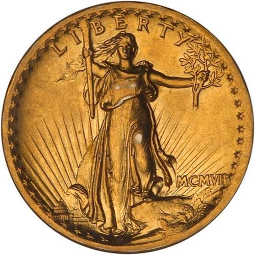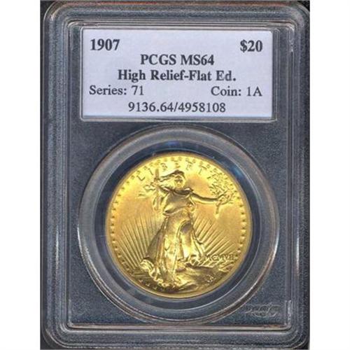 <b>1907 $20 St. Gaudens. High relief, flat rim. PCGS graded MS64.</b> This lovely Roman Numerals specimen would do justice to a near-Gem type collection. There are few abrasions, and those that are present are barely perceptive to the casual observer. A sharp looking specimen with splendid luster and toning.