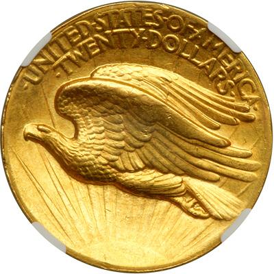 1907 $20 St. Gaudens. High relief, wire rim. NGC graded AU-58. Light golden toning. The only evident rub on either side is seen on Liberty's knee and breast, and the olive-gold features retain the sharpness of detail that accounts for the fascination of this single-year High Relief issue. Lightly abraded with a few tiny ticks on the eagle's wing feathers.