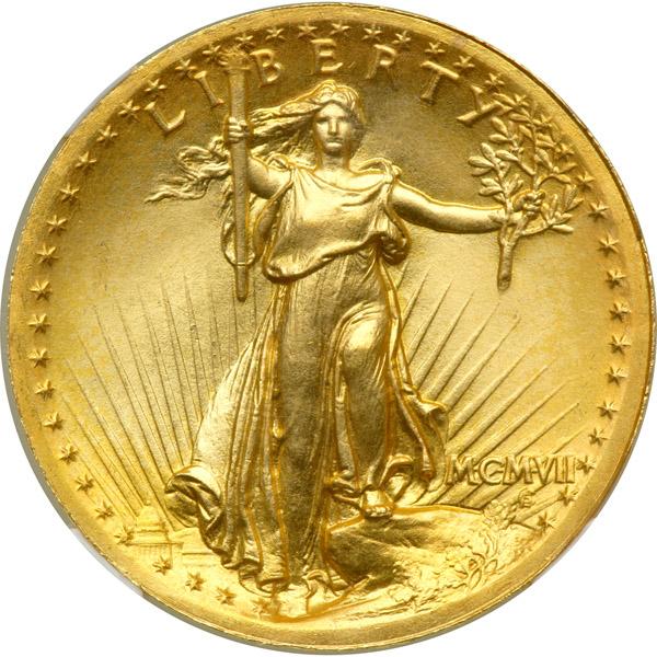 1907 $20 St. Gaudens. High relief, wire rim. NGC graded MS-67. Star. A stunning superb gem example exhibiting beaming golden yellow surfaces deepening at the extreme borders. A spectacular star-rated gem whose razor-sharp devices rise like a phoenix bird from the pure-as-gold satiny surface. The fields and devices glow with an almost surreal golden radiance due to the pristine nature of the surface; there are neither handling marks nor spotting of any kind to impair coin's originality. If you as an advanced or specialist collector have been hankering for a first class example of America's most beautiful gold coin, one whose immense presence and technical excellence would be almost impossible to improve on, you will want to ready a bid for this Mint State 67 High Relief. Superb!