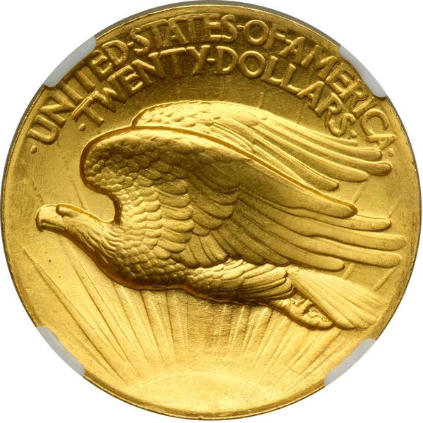 As was true of the 1907 Indian designs for the $10 gold Eagle, the present Saint-Gaudens-inspired masterpiece was the end product of President Theodore Roosevelt's orchestration with the most famous American sculptor at the time. As originally envisioned, the mint would redo the entire spectrum of American coinage from the lowly bronze one-cent piece through the noble golden double eagle. In correspondence, Saint-Gaudens felt the 1857 Flying Eagle cent was the finest motif found on any American coin, which is probably the reason he chose a similar eagle for his High Relief $20 gold reverse. Pop 1; 1 in 67+Star, 2 in 68, 1 in 68 Star .
