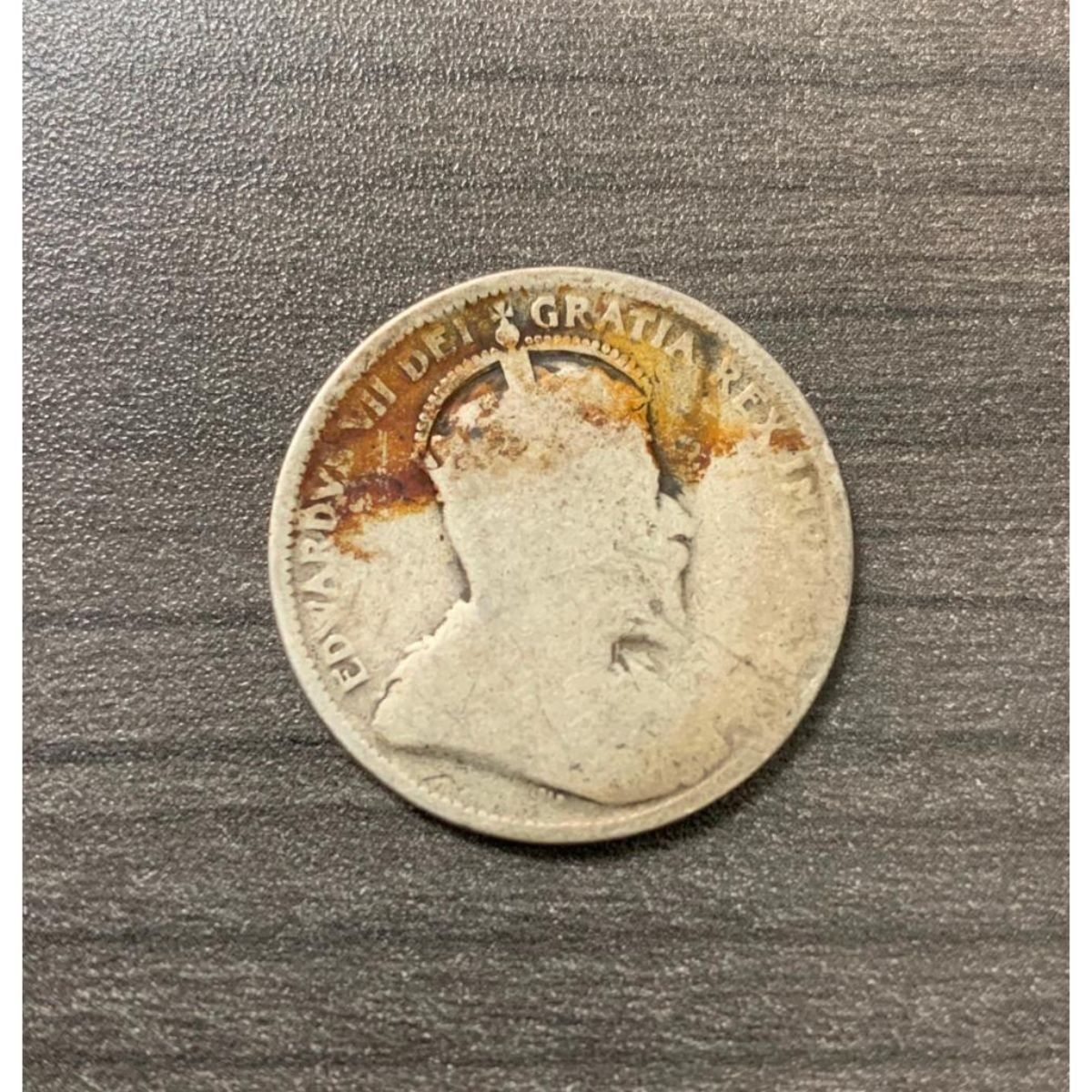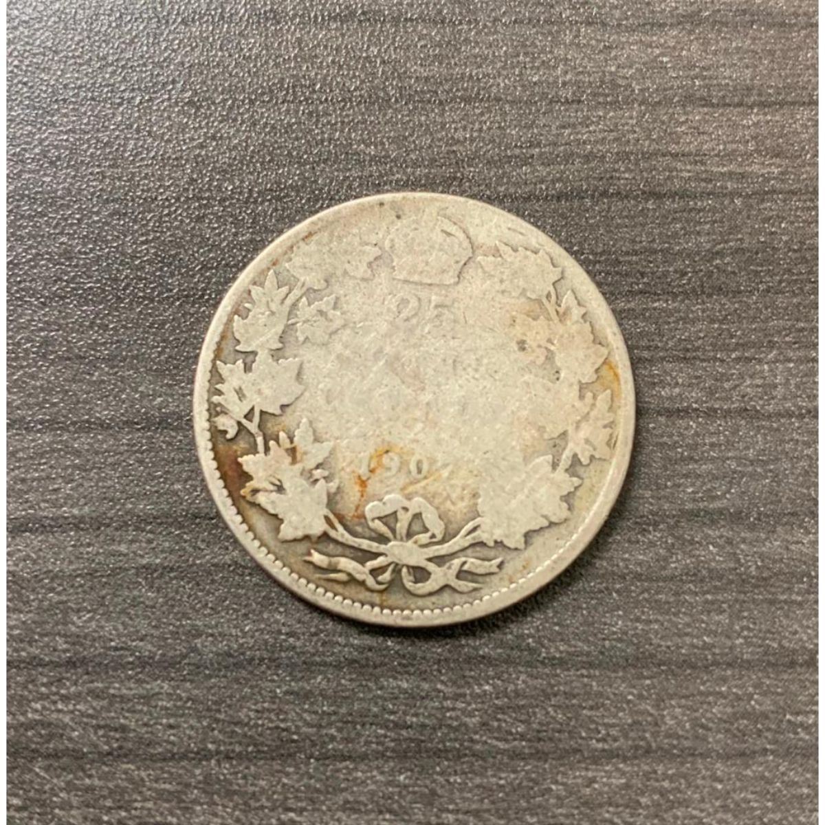 Obverse The portrait in right profile of Edward VII is surrounded with the inscription "EDWARDVS VII DEI GRATIA REX IMPERATOR" (Edward VII, King and Emperor by the grace of God) 1902-1907: ↑↓ 1908-1910: ↑↑ Lettering: EDWARDVS VII DEI GRATIA REX IMPERATOR Engraver: George William de Saulles Reverse The face value, accompanied with the inscription "CANADA", is surrounded with two maple boughs and a crown. From 1908 to 1910, the boughs were wider. Lettering: 25 CENTS CANADA 1907 Engraver: W.H.J. Blakemore Edge Reeded Specifications Country: Canada Type: Standard circulation coin Years: 1902-1909 Value: 25 Cents (0.25 CAD) Currency: Canadian dollar (1858-date) Composition: Silver (.925) Weight: 5.81 g Diameter: 23.62 mm Shape: Round