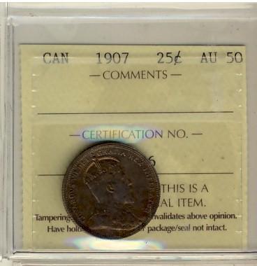 1907 25¢ ICCS AU50. Intense gold and red shades.