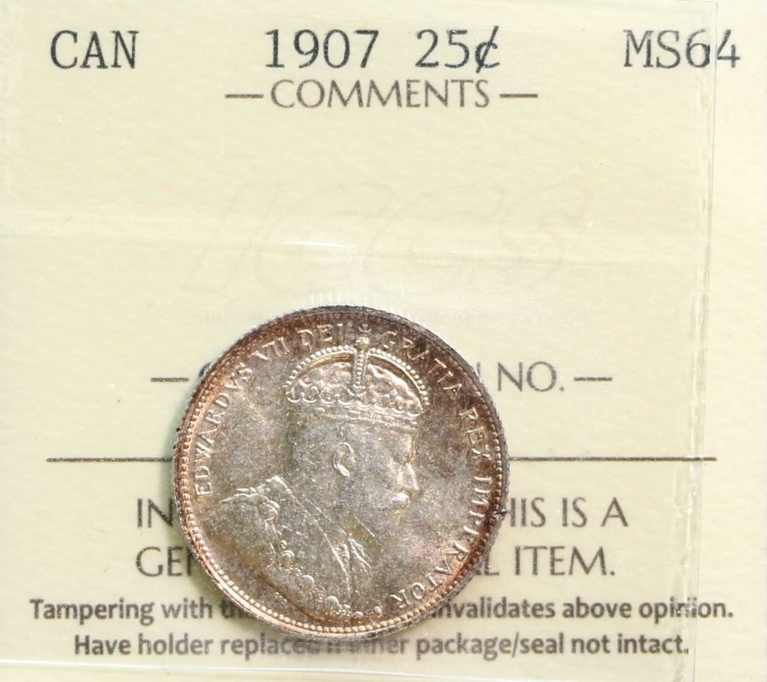 1907 25¢ ICCS Choice Mint State-64. A superb example for grade with stong lustrous fields surrounded by light orange tints.