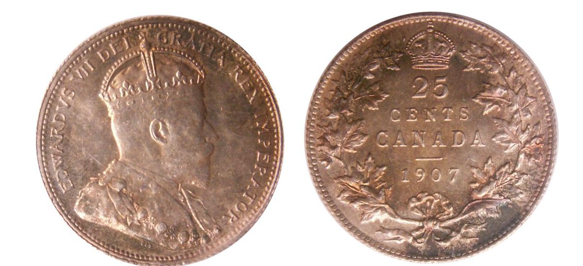 1907 25¢ ICCS MS64. Scattered shades with underlying lustre.