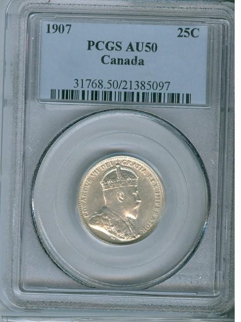 1907 25¢ PCGS AU50. Clean and well struck example.
