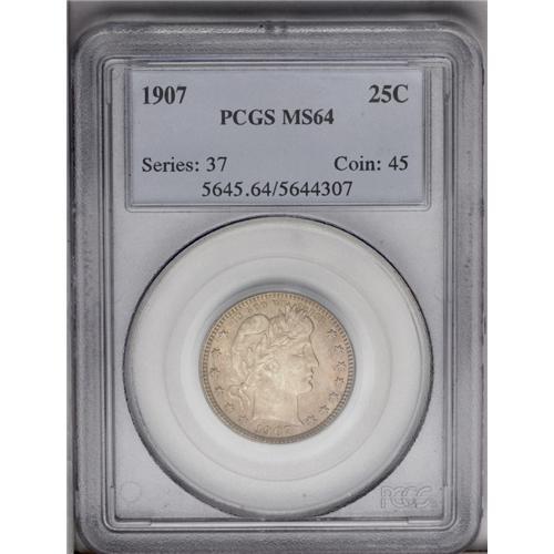 1907 25C MS64 PCGS. The obverse has a delicate patina 1907[25C] MS64 PCGS.