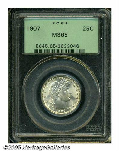 <B>1907<25C> MS65 PCGS.</B></I> Well struck with bright satiny luster, carefully preserved surfaces, and faint golden toning over each side. Housed in a green label holder from PCGS. Population: 30 in 65, 10 finer (5/05).