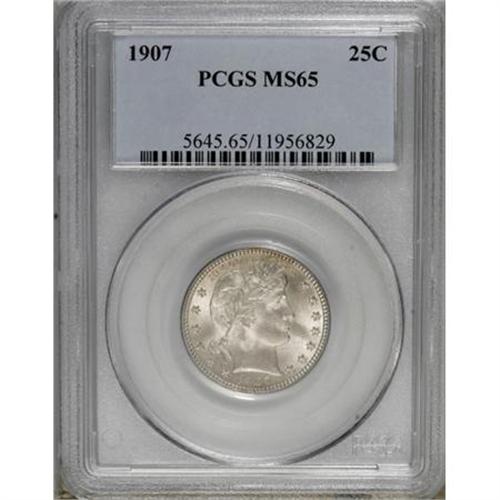 <B>1907 25C MS65 PCGS.</B></I> This penetratingly struck Gem has vibrant luster and an unblemished appearance. Faint gold toning ensures the originality. Population: 34 in 65, 15 finer (1/08).<BR><BR><B>Coin Engraver:</B> Charles E. Barber<BR><BR><b>Shipping:</b> Coins & Currency (<a target="_blank" href="http://www.heritageauctions.com/common/shipping.php">view shipping information</a>)