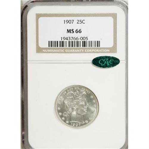 <B>1907 25C MS66 NGC. CAC.</B></I> A brilliant and beautiful Premium Gem with exemplary luster and nearly immaculate surfaces. Crisply struck and exemplary in all regards. Census: 8 in 66, 3 finer (1/08).<BR><I>From The Southwest Collection.</B></I><BR><BR><B>Coin Engraver:</B> Charles E. Barber<BR><BR><b>Shipping:</b> Coins & Currency (<a target="_blank" href="http://www.heritageauctions.com/common/shipping.php">view shipping information</a>)