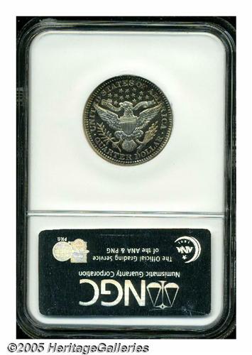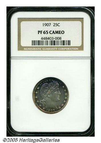 <B>1907<25C> PR65 Cameo NGC.</B></I> Flashy proof surfaces are visited by iridescent lavender and cobalt-blue patina around the borders. The design elements are sharply struck, and stand out nicely against the mirrored fields. There are no mentionable contact marks to report. Population: 5 in 65, 19 finer (5/05).