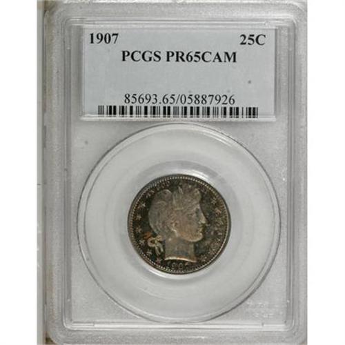<B>1907 25C PR65 Cameo PCGS.</B></I> Iridescent multicolored toning bathes both ides of this lovely Gem Cameo. An attentive strike brings out nice detail on the design elements, save for the usual softness on the upper right corner of the shield. Devoid of mentionable marks. Population: 12 in 65, 15 finer (12/07).<BR><BR><b>Shipping:</b> Coins & Currency (<a target="_blank" href="http://www.heritageauctions.com/common/shipping.php">view shipping information</a>)