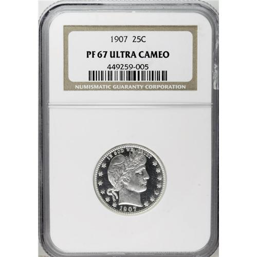 <B>1907 25C PR67 Ultra Cameo NGC.</B></I> This Superb proof is a stunning Gem with exceptional surfaces. The obverse and reverse have full brilliance with deeply mirrored fields and highly lustrous devices. There is no evidence of toning on either side. Few examples survive in such wonderful condition. Census: 4 in 67, 1 finer (10/06).<BR><BR><b>Shipping:</b> Coin/Currency (<a target="_blank" href="http://www.heritageauctions.com/common/shipping.php">view shipping information</a>)