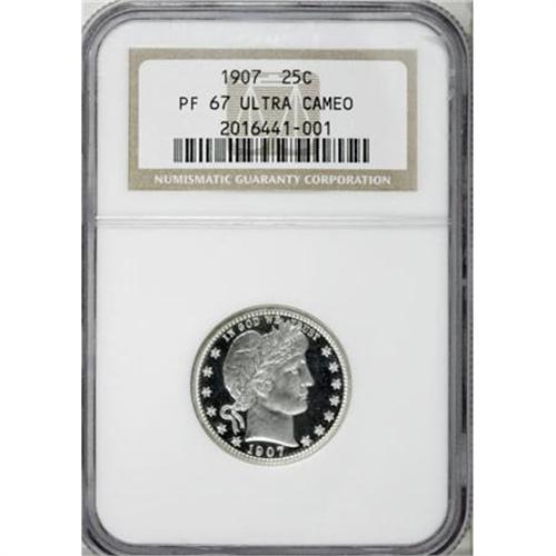 <B>1907 25C PR67 Ultra Cameo NGC.</B></I> Frosty, snow-white motifs stand out against the deeply mirrored fields of this Superb Gem. Untoned surfaces are devoid of mentionable marks and show solidly struck design features. Great technical quality and aesthetic appeal. Census: 4 in 67 Ultra Cameo, 1 finer (11/07).<BR><BR><b>Shipping:</b> Coins & Currency (<a target="_blank" href="http://www.heritageauctions.com/common/shipping.php">view shipping information</a>)