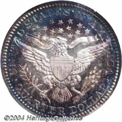 <B>1907<25C> PR68 NGC.</B></I> Very deeply toned, both sides exhibit electric-green, purple-red, and golden-brown toning, with lighter golden-gray colors near the centers. As would be expected from the grade, the surfaces are deeply reflective and essentially flawless. Only 575 proofs were struck, a low mintage number even for a Barber Quarter issue. <BR><BR><B>Important notice:</B> Heritage usually auctions material at the rate of 200-250 lots per hour. On some occasions eBay Live bid software or the Internet may not be able to keep up with the pace of the auction. We recommend placing a realistic absentee bid now as insurance to avoid disappointment. Occasionally the auctioneer may eliminate or reject an eBay Live bid, and the auctioneer may also reopen a lot after the close of the eBay live bidding (usually because we missed an audience bid), and may reject your bid even if it shows you as the winning bidder. By bidding via eBay Live, you agree that Heritage may award the lot to another bidder at its sole discretion under the circumstances described above or any other reasonable circumstances. Since eBay bids are not shown to us until we open the lot on the floor, we treat those bids just like floor bids. In most cases the floor responds before the eBay bid is presented to us, due to Internet lag time, so for consistency we have made it a policy that floor bids are always considered first over tie eBay live bids. Also please note that all Heritage lots purchased through eBay Live carry a 20% Buyer's Premium. Please make sure you read the Terms and Conditions before you bid. </span></font></tr></table></td></tr></table>